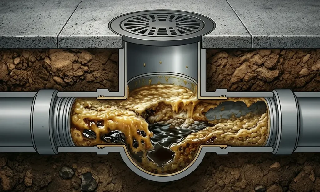 Öl und Wasser verbinden sich nicht. Im Abwassersystem setzt sich das Öl an den Rohrwänden ab, härtet aus und bildet Verstopfungen — zuerst im eigenen Betrieb, dann im öffentlichen Kanalnetz.